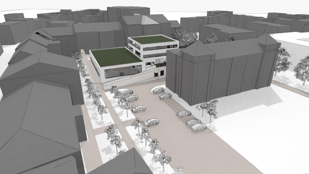 Wierzymy jednak, że nadejdzie taki czas, kiedy wybudowanie sali wielofunkcyjnej dla potrzeb szkół i parafii będzie znowu tematem aktualnym. Ze względów konserwatorskich nie ma raczej szans na usytuowanie takiej kubatury na Placu Kościelnym. Lokalizacja we wnętrzu wpomnianego wyżej kwartału jest jedyną realną możliwością. Przy okazji tej inwestycji konieczne byłoby uporządkowanie chaotycznej zabudowy (garaże i budynki gospodarcze) jak również realizacja przejścia pieszego pomiędzy Placem Wolności i Placem Kościelnym. Dalszą korzyścią tej koncepcji jest wybudowanie parkingu dla 40 samochodów. Jako inwestycja towarzysząca jest przewidywana rewitalizacja elewacji zabudowy historycznej wnętrza kwartału.