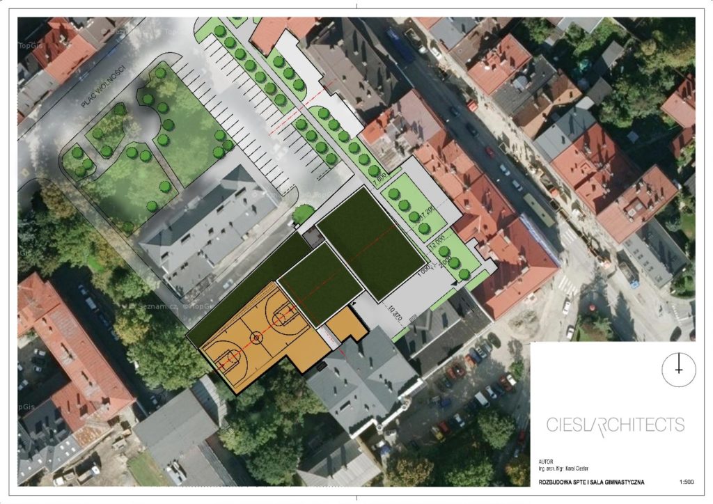 Lokalizacja inwestycji wewnątrz istniejącego kwartału powoduje duże ograniczenia w kształtowaniu nowej zabudowy, także ze względu na potrzebę odniesienia się do historycznego układu urbanistycznego i jego uwzględnienia jako wartości miejsca. Priorytetowo przyjęto lokalizację wyższego budynku szkolnego jakoby „w cieniu” wysokiego byłego budynku policji (Plac Wolności nr 3), tak by nie był widoczny z Placu Wolności. Bryła sali gimnastycznej jest wpuszczona w teren, a jej wysokość ok. 5 m ma charakter zabudowy parterowej i nie ingeruje w układ urbanistyczny, nie zamyka kwartału w miejscu, w którym nigdy w historii nie był zamknięty.