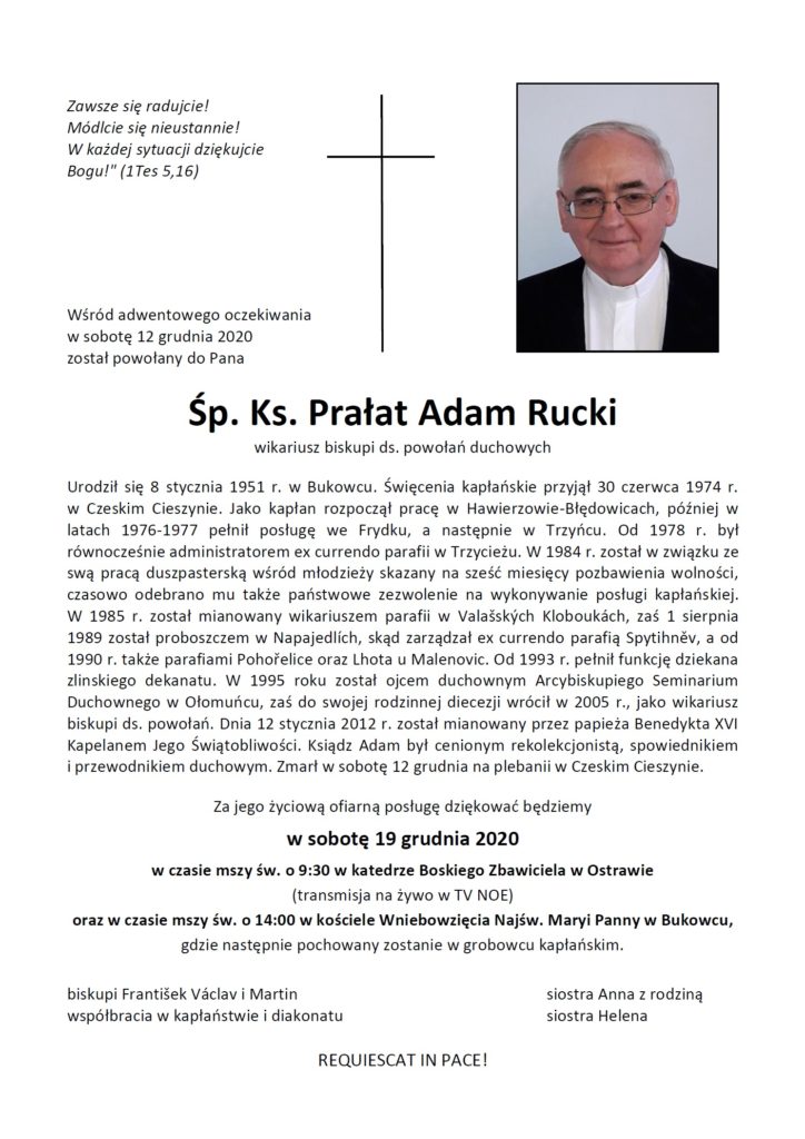 Uprostřed adventního očekávání byl na věčnost povolán Mons. Adam Rucki, biskupský vikář pro péči o duchovní povolání, spirituál kněží a exercitátor. Zemřel v sobotu 12. prosince 2020 v Českém Těšíně ve věku nedožitých 70 let.