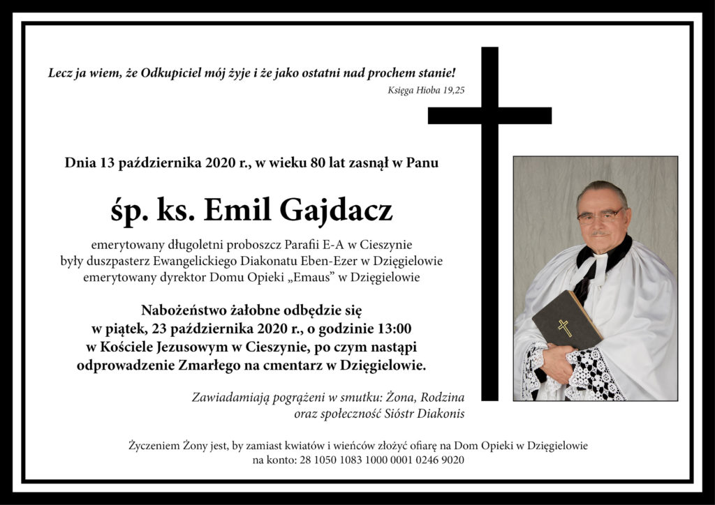 Dnia 13 października zmarł w szpitalu w Cieszynie  śp. ks. Emil Gajdacz – emerytowany proboszcz pomocniczy parafii w Cieszynie, dyrektor Domu Opieki „Emaus” w Dziegielowie, duszpasterz Diakonatu „Eben-Ezer”. Chorował na covid-19. Przeżył 80 lat.